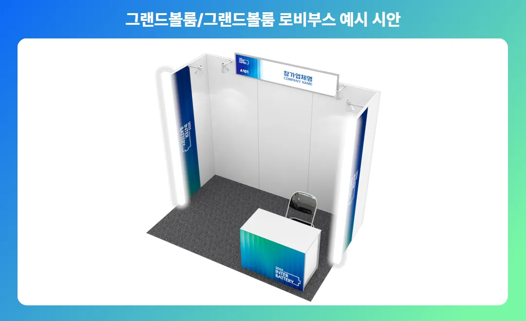 천장에는 배너 등 경량물에 한하여 일부 구역(A홀, C홀 내 일부구역)에 설치 가능하며, 사용 전 인터배터리 사무국의 위치 확인을 받은 후 가능한 경우 신청 가능합니다.