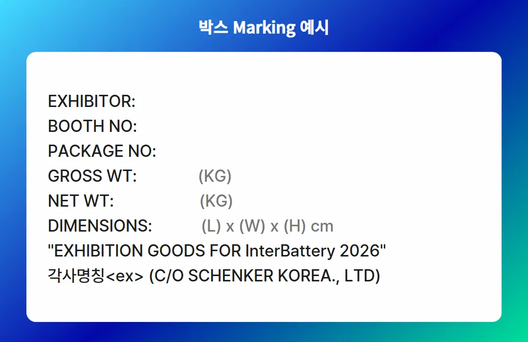 모든 전시품의 포장 면에는 다음과 같이 MARKING 하시기 바랍니다.