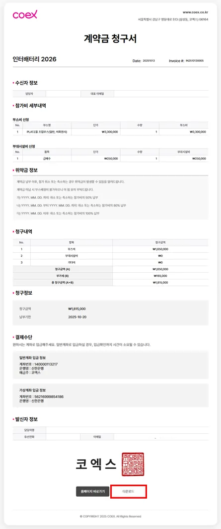 기존 사이버코엑스 시스템을 통해 발행된 계약금에 대한 인보이스는 조회되지 않을 수 있습니다.