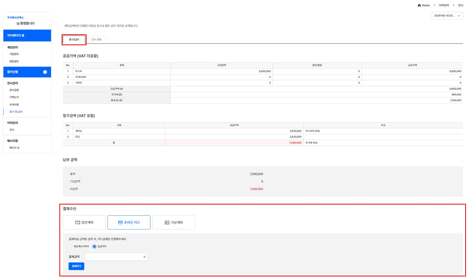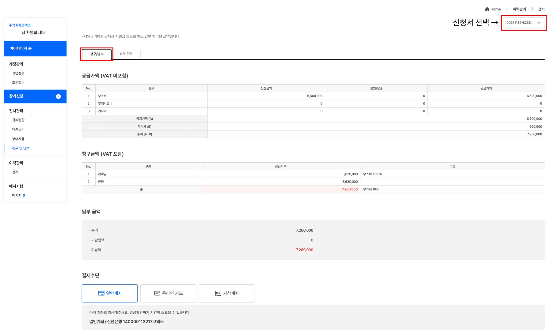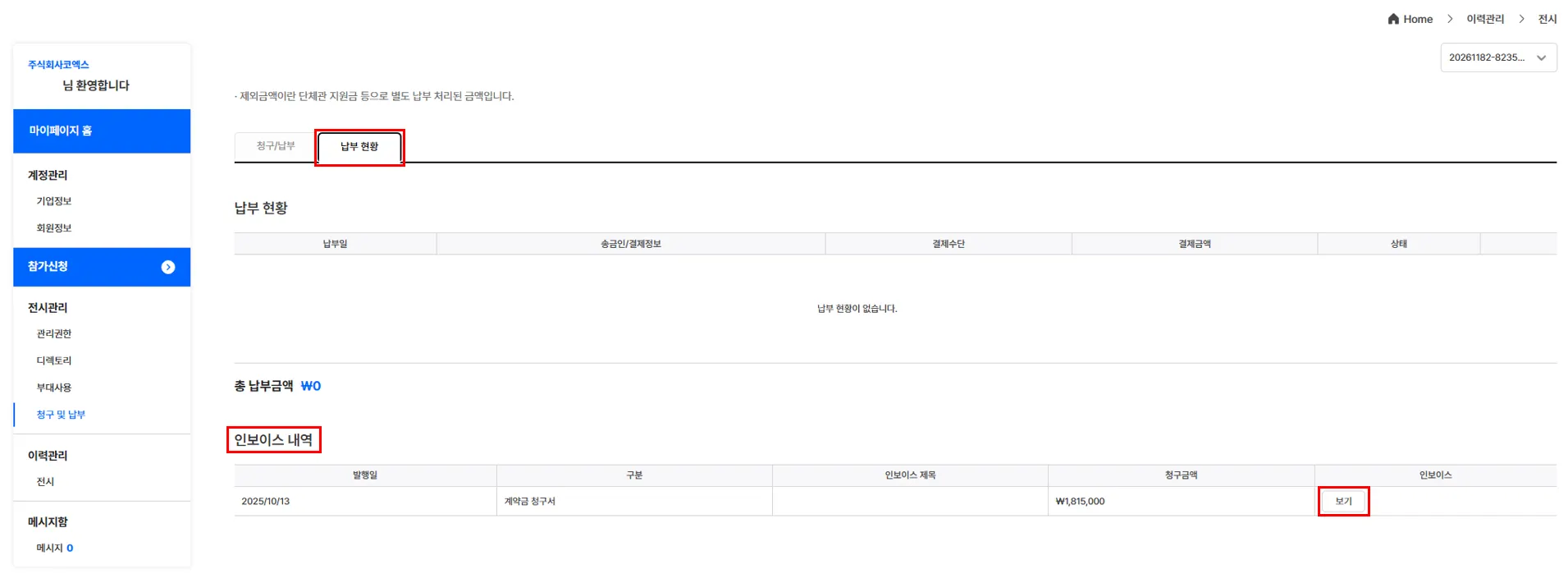 마이페이지 내 [전시관리] > [청구 및 납부]