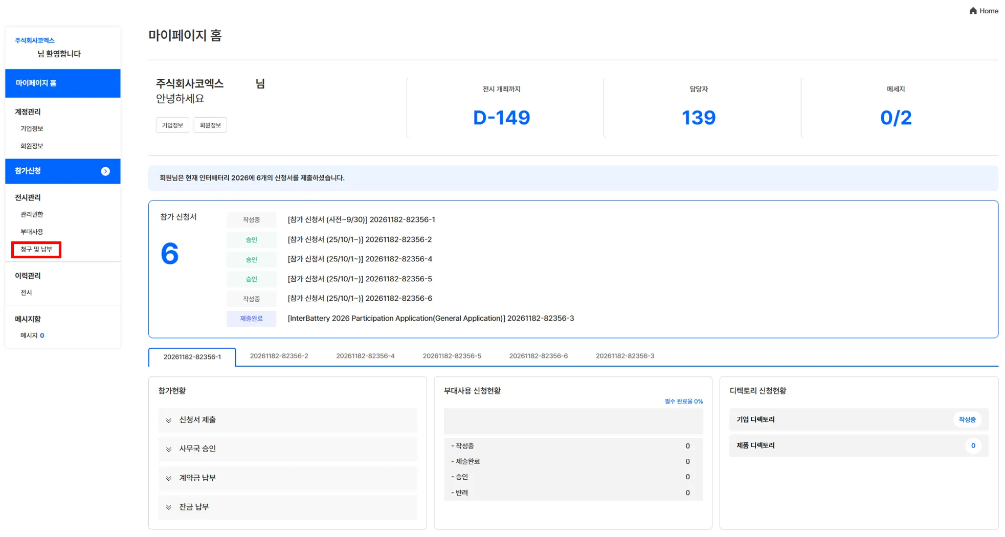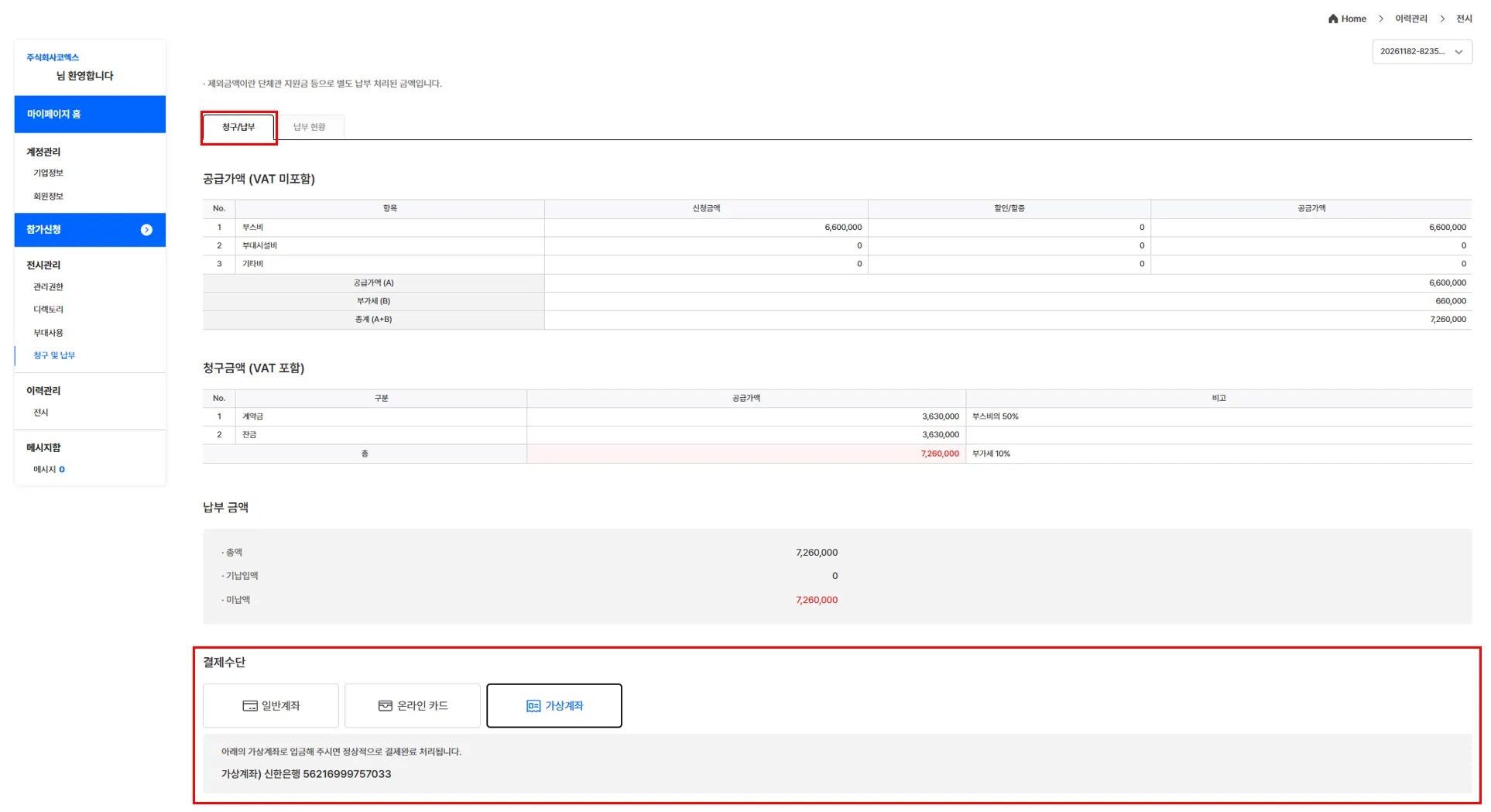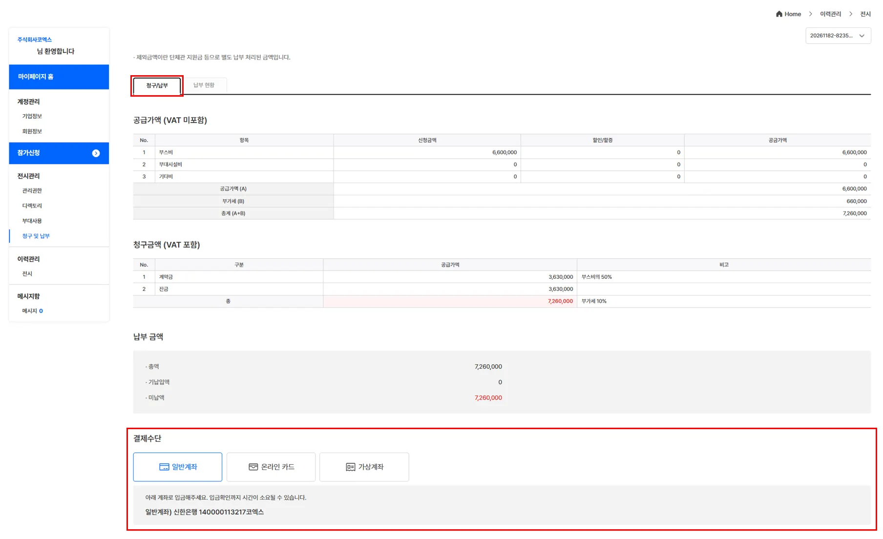 마이페이지 내 [전시관리] > [청구 및 납부]