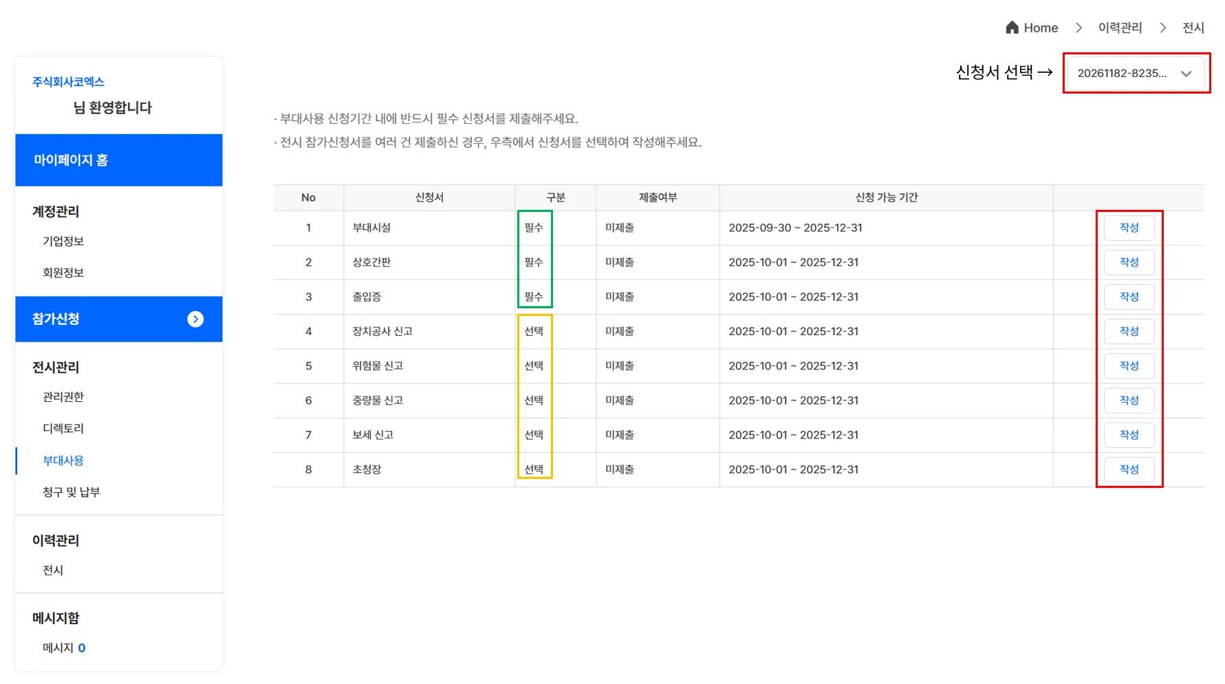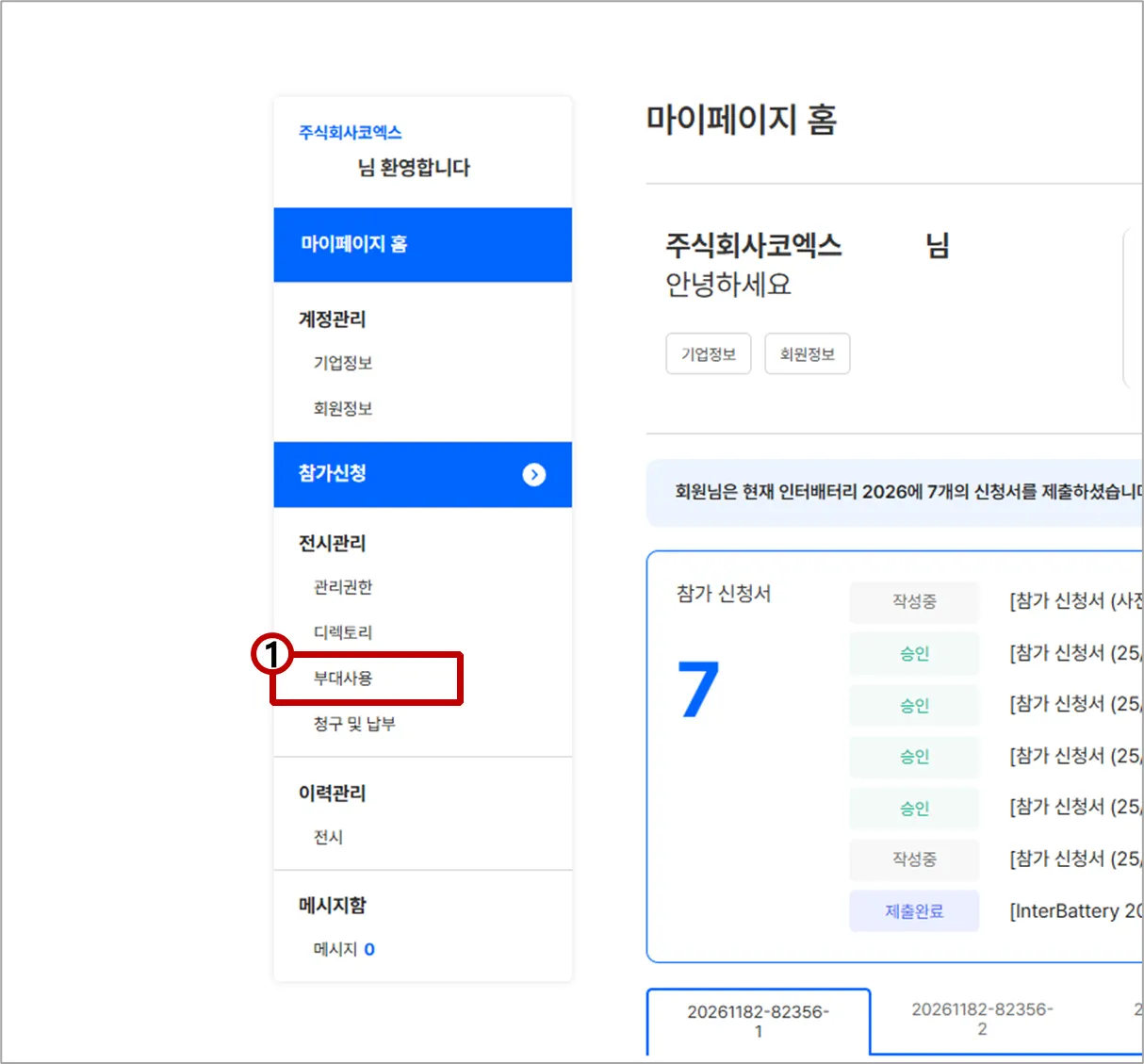 좌측 카테고리에서 [전시관리] > [부대사용] 클릭