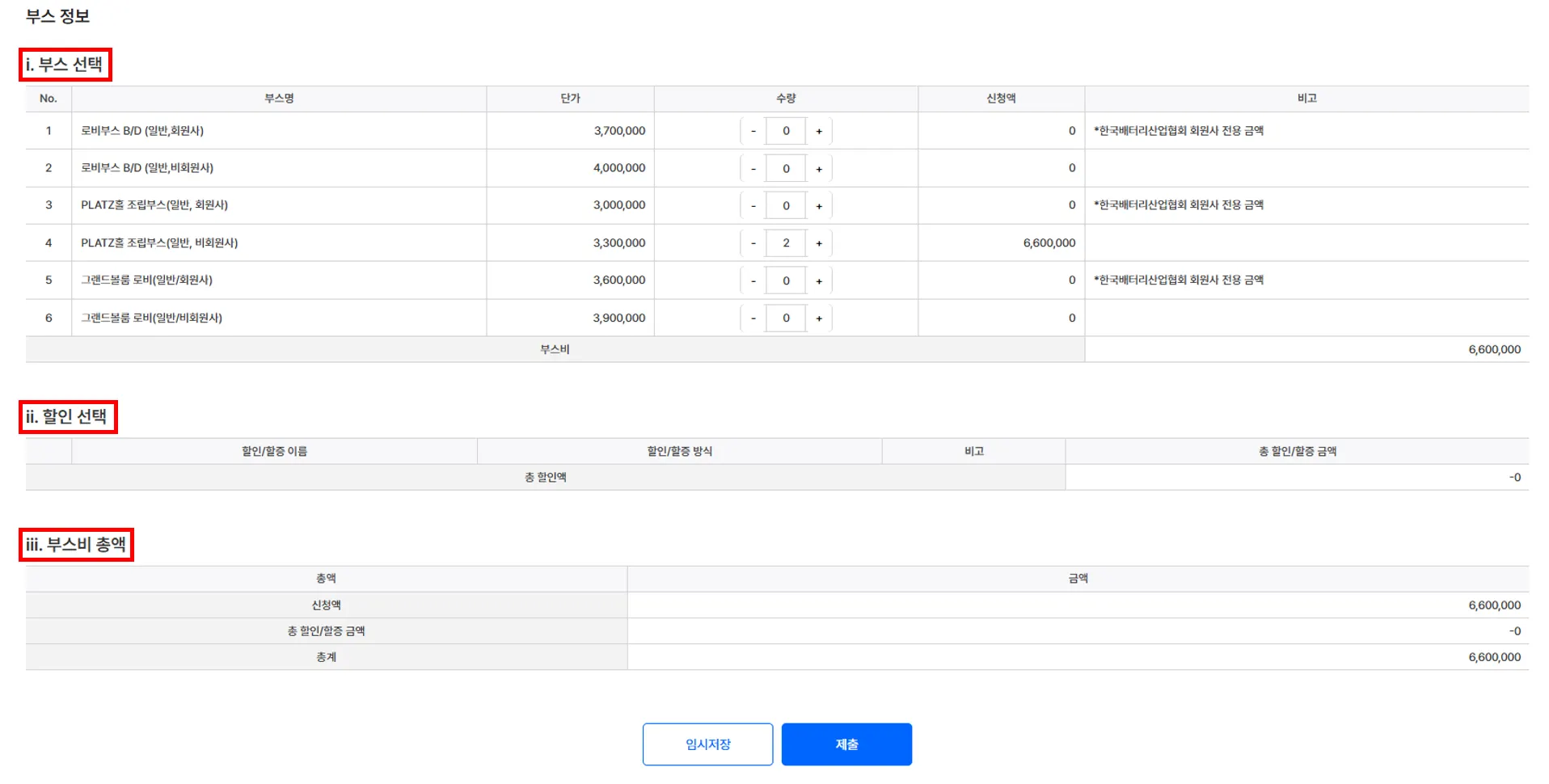 [부스 정보]에서 참가하고자 하는 [부스 선택] 후 [할인 선택] 및 [부스비 총액] 확인 후 제출