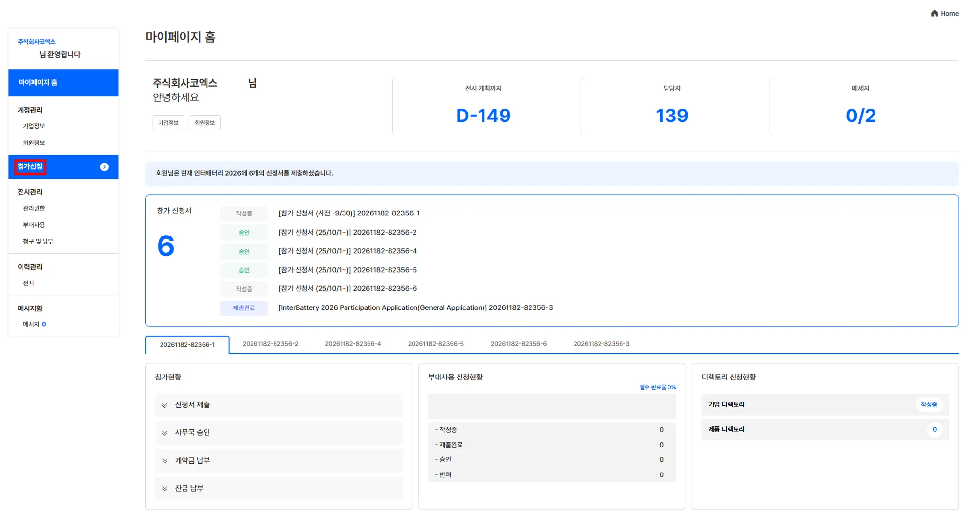 하단 목록에서는 작성중 또는 제출 완료한 참가신청서 확인 가능합니다.