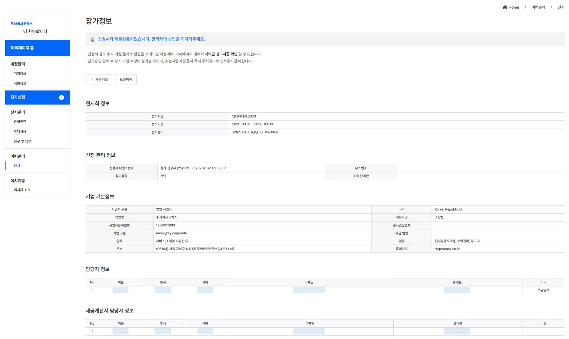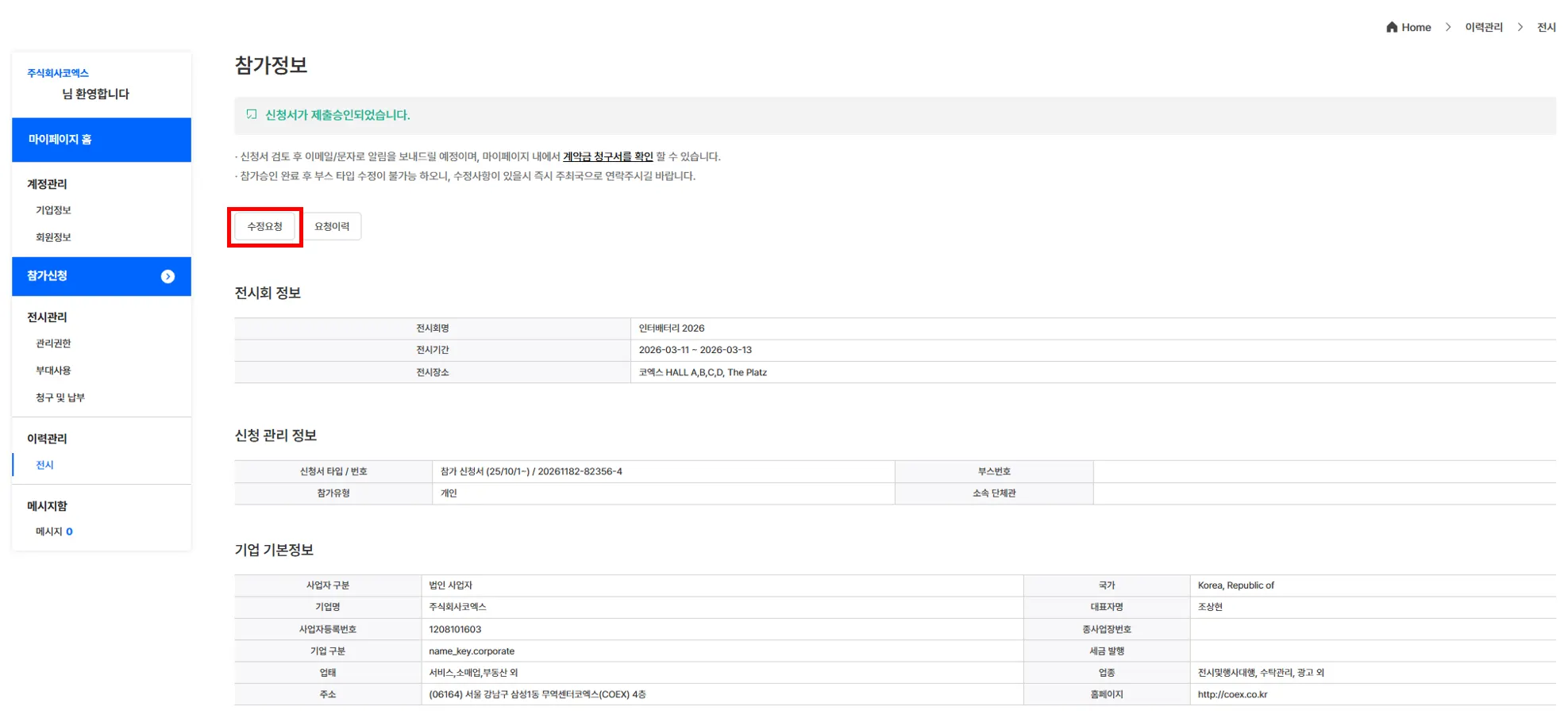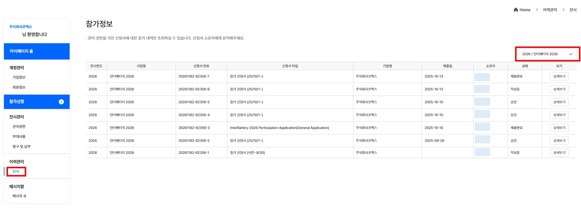 마이페이지 내 [이력관리] > [전시] 우측 목록에서 [2026 / 인터배터리 2026] 선택