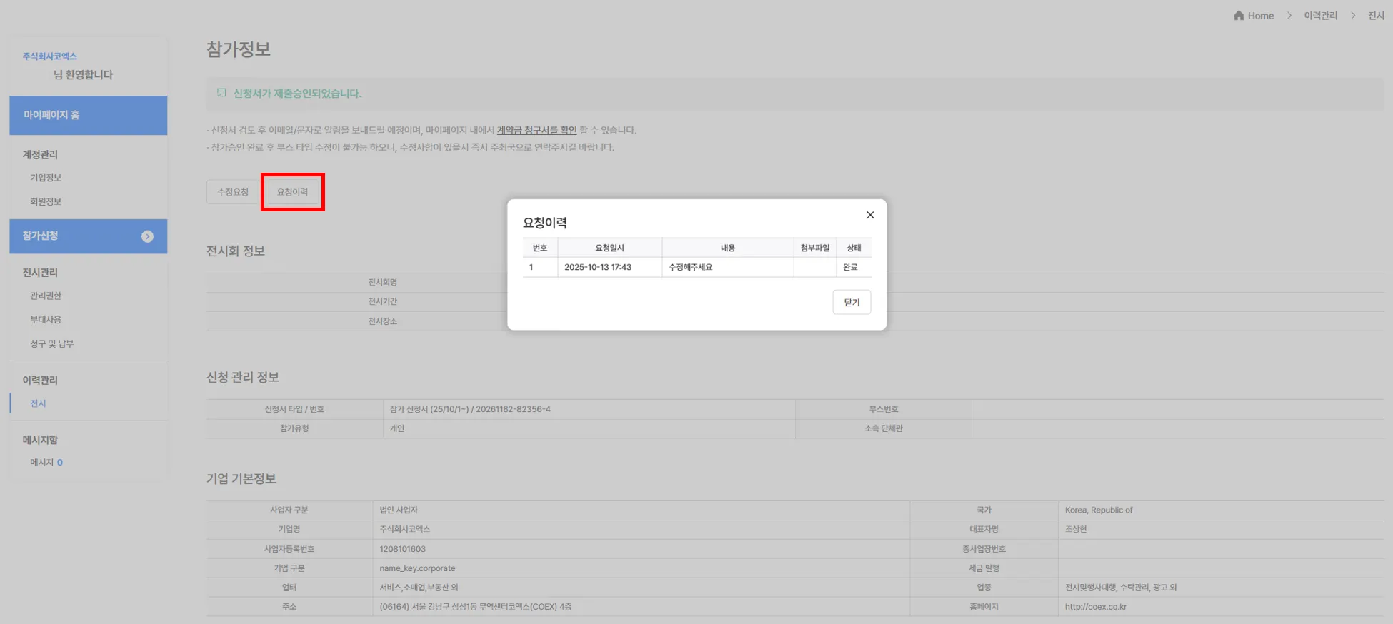 [요청이력]에서 수정 요청 사항 진행 확인 가능