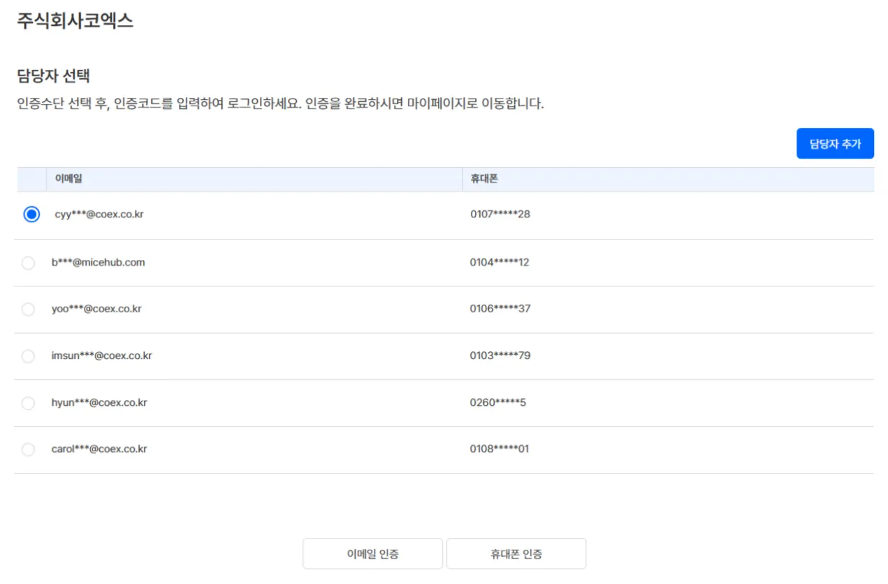 담당자 선택 후 이메일 혹은 휴대폰 인증 진행